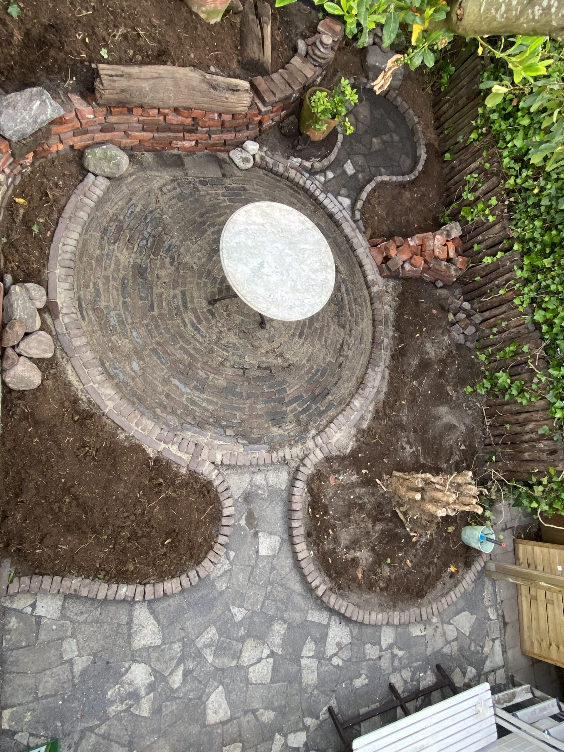 We gebruiken bijvoorbeeld de tegels van de oude stoep voor een bankje, de klinkers van de straat voor een stapelmuurtje. Elk kiertje biedt ruimte aan een plant. We halen tuinaarde op van iemand die het over heeft uit de buurt, en zand van een bouwproject nabij. Er komt bijvoorbeeld een natuurvijver van leem of een pergola van resthout.